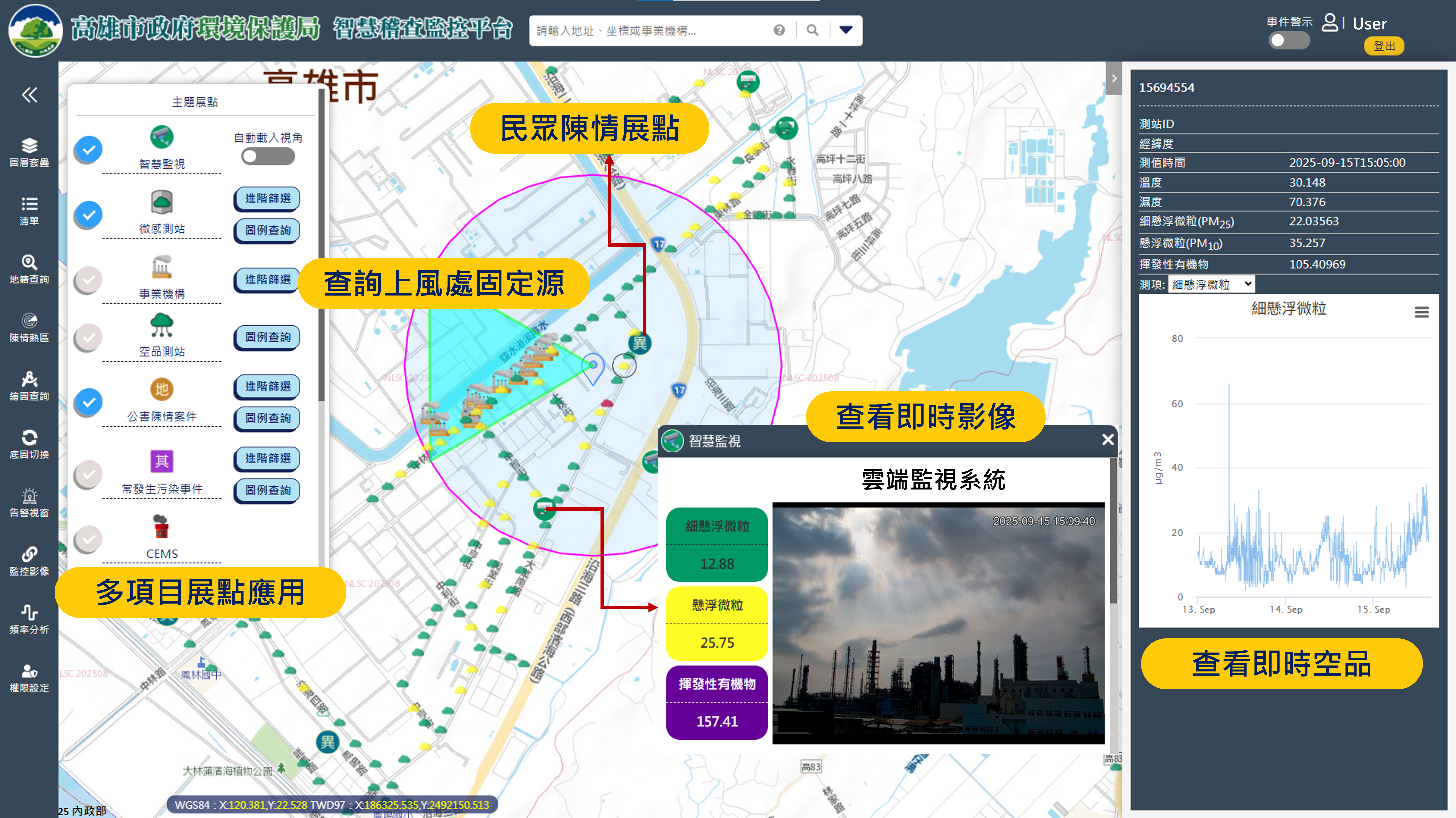 為即時掌握空氣污染行為,高雄市政府環境保護局110年即導入智慧即時影像辨識技術,可對污染熱區來進行全時監控,當智慧系統偵測到異常空污排放事件,會自動透過通訊軟體通知稽查員到場處理,以利環保局可迅速掌握污染現況。