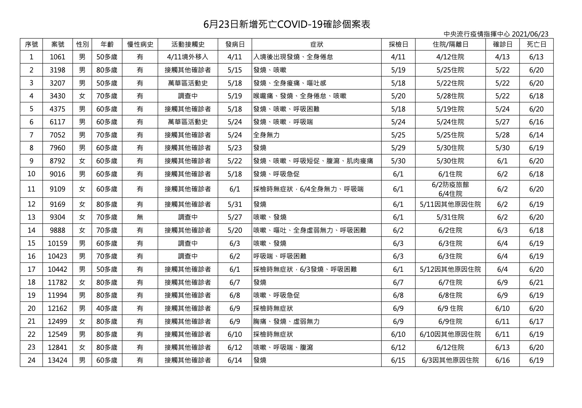 23日新增24例死亡個案,為男性15位、女性9位,年齡介於40多歲至80多歲,發病日介於4月11日至6月14日,確診日介於4月13日至6月16日,死亡日介於6月13日至6月21日,詳如新聞稿附件。