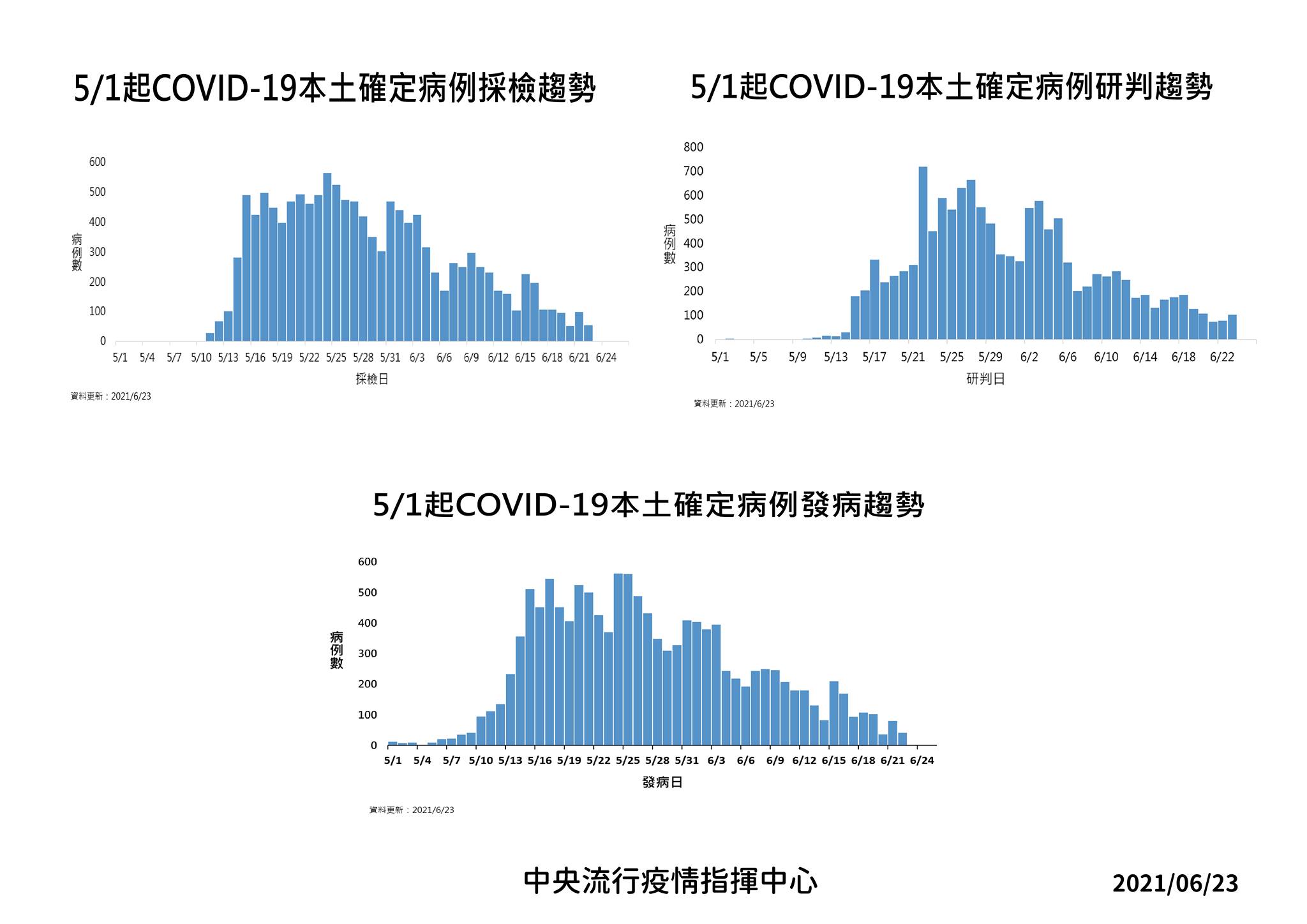 23日新增之104例本土病例,為45例男性、59例女性,年齡介於未滿5歲至80多歲,發病日介於今(2021)年6月10日至6月22日。個案分佈以新北市45例最多,其次為臺北市22例,高雄市及新竹縣各9例,桃園市7例,苗栗縣4例,基隆市3例,宜蘭縣2例,彰化縣、南投縣及屏東縣各1例。其中雙北地區以外縣市37例中,28例為已知感染源,5例關聯不明,4例疫調中;相關疫情調查持續進行中。