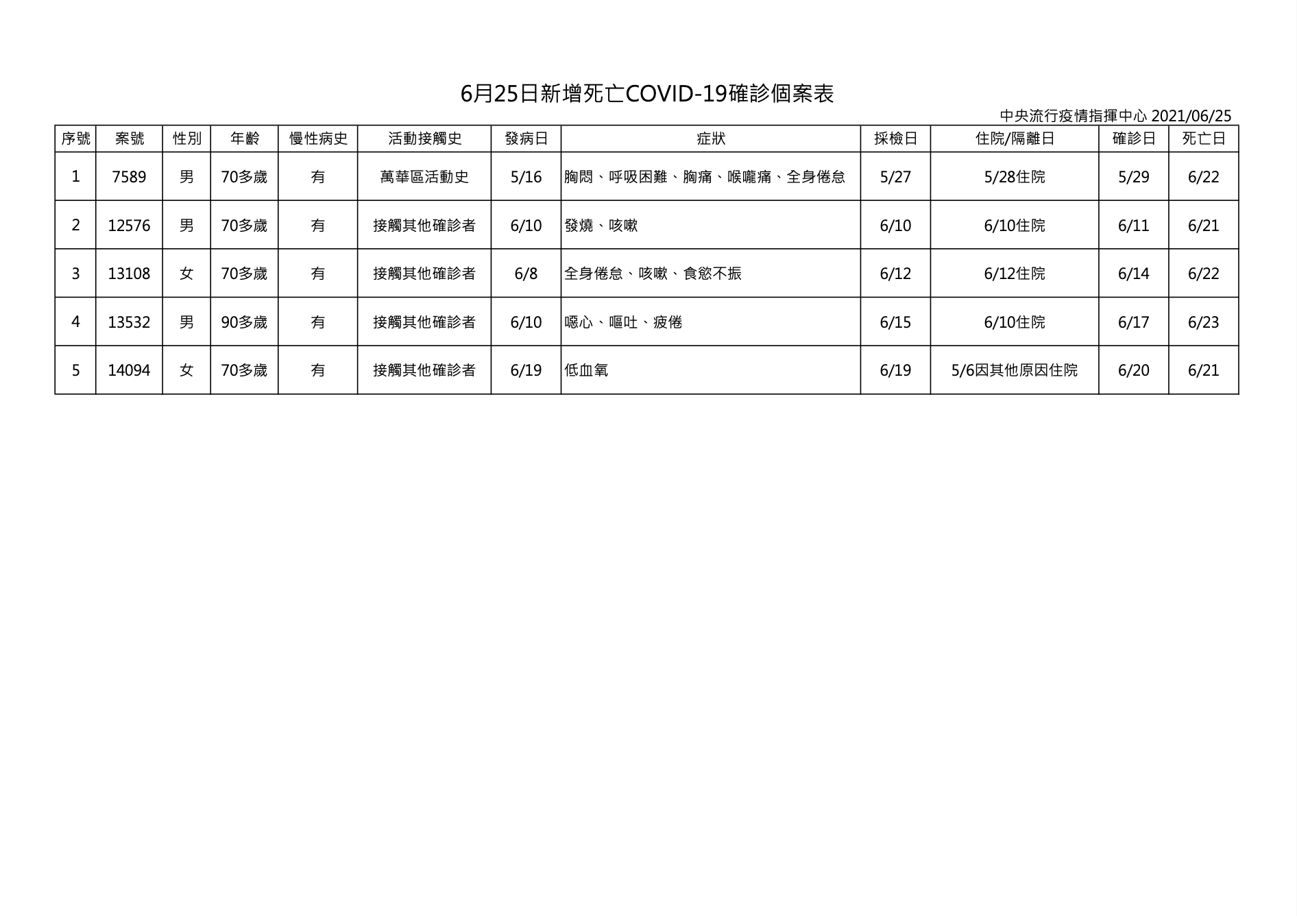 25日新增5例死亡個案,為3例男性、2例女性,年齡介於70多歲至90多歲,發病日介於5月16日至6月19日,確診日介於5月29日至6月20日,死亡日介於6月21日至6月23日,詳如新聞稿附件。