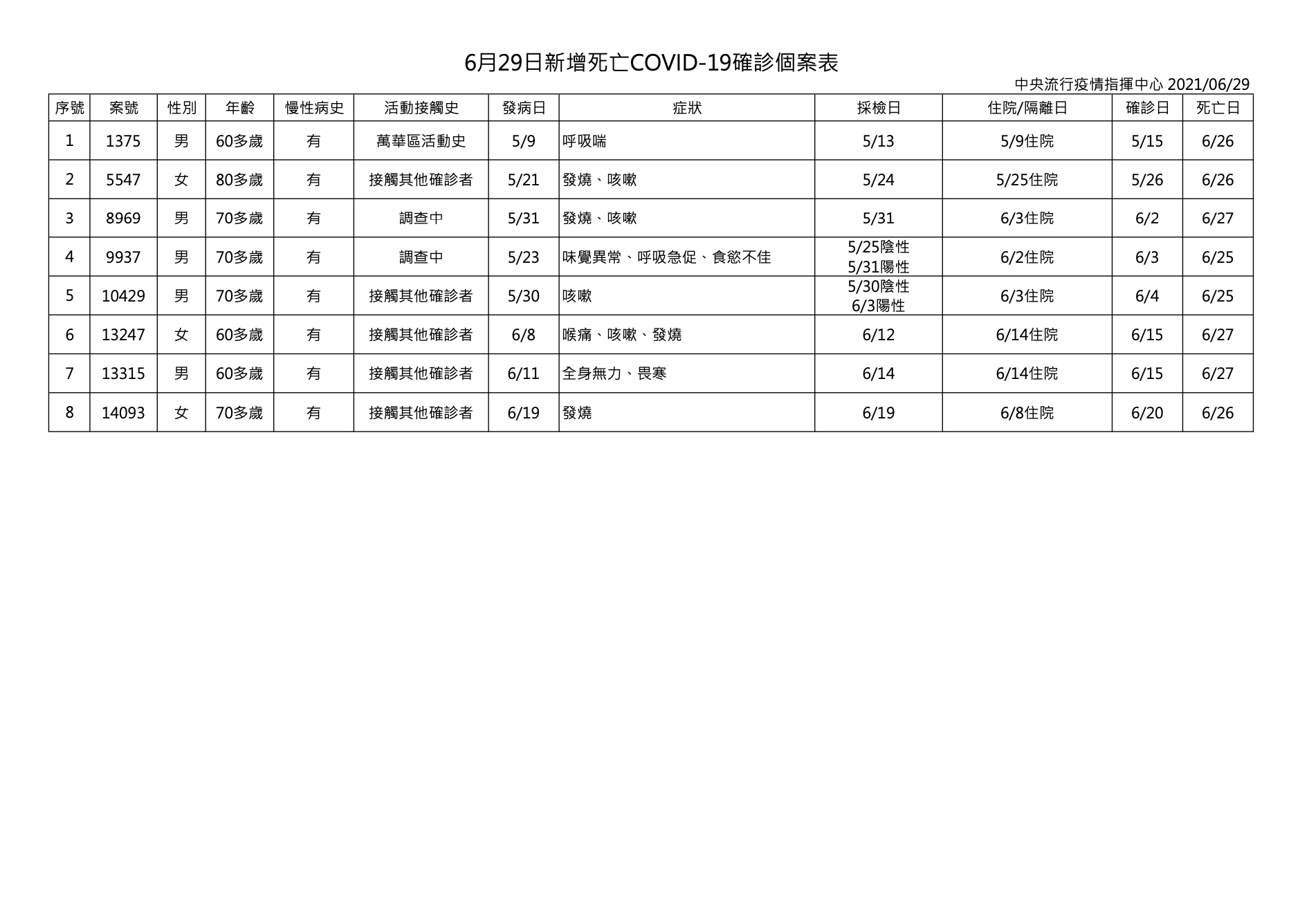 29日新增8例死亡個案,為5例男性、3例女性,年齡介於60多歲至80多歲,發病日介於5月9日至6月19日,確診日介於5月15日至6月20日,死亡日介於6月25日至6月27日;詳如新聞稿附件。