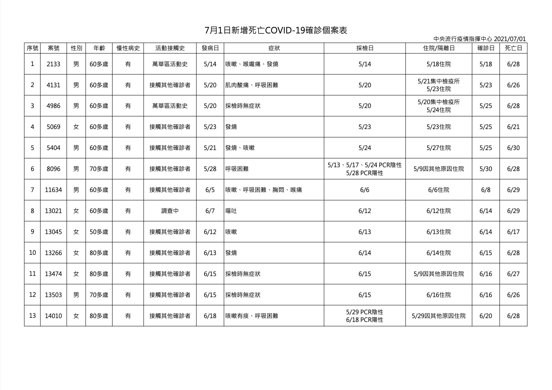 1日新增13例死亡個案,為7例男性、6例女性,年齡介於50多歲至80多歲,發病日介於5月14日至6月18日,確診日介於5月18日至6月20日,死亡日介於6月17日至6月30日;詳如新聞稿附件。