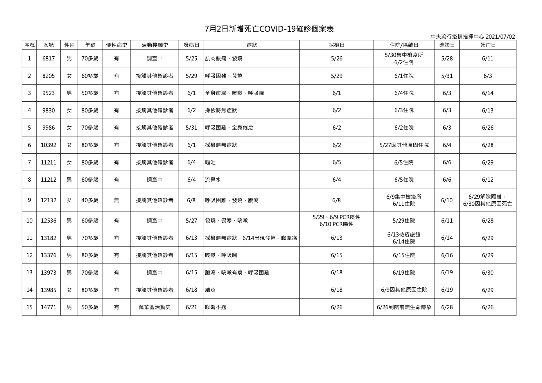 2日新增15例死亡個案,為8例男性、7例女性,年齡介於40多歲至80多歲,發病日介於5月25日至6月21日,確診日介於5月28日至6月28日,死亡日介於6月3日至6月30日;詳如新聞稿附件。