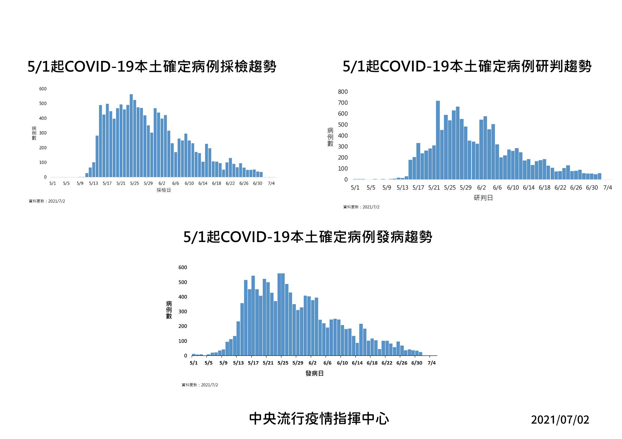 2日新增之57例本土病例(其中22例為居家隔離期間或期滿檢驗陽性者),為25例男性、32例女性,年齡介於未滿5歲至90多歲,發病日介於今(2021)年6月22日至7月1日。個案分布以臺北市29例最多,其次為新北市15例、新竹縣4例、桃園市及基隆市各3例、臺中市2例、新竹市1例;其中28例為已知感染源、6例關聯不明、23例調查中,相關疫情調查持續進行中。